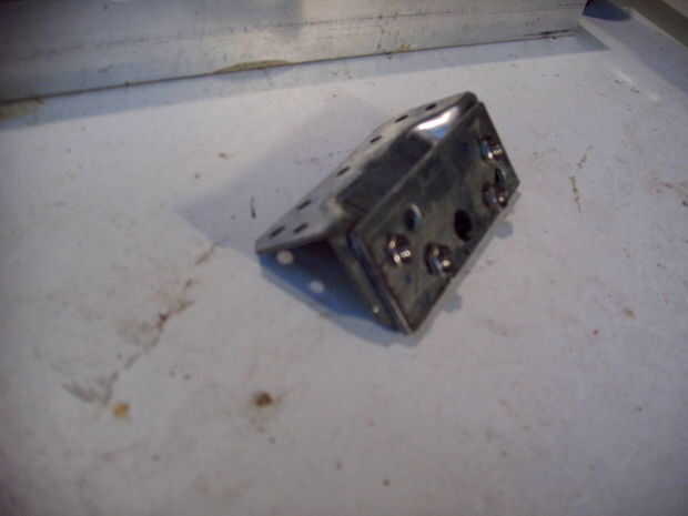 Corte sobre una longitud de 3" de 1" de ancho, 1/8" de acero y tornillo a una escuadra de 90 grados Simpson fuerte lazo como en la imagen. El soporte proporciona la fuerza del ángulo y el acero grueso es una superficie de Monte fuerte, es decir, un piso más robusto que bloquear la rueda (con cierre rápido). Dejar espacio para el hardware de lanzamiento rápido de la rueda. Taladre un agujero de 23/64", que adapta el árbol típico de la mtb. Este agujero está centrada aproximadamente en el soporte, centrado alrededor de 3/8" del borde (mantenerlo exactamente 3/8" no es crítico, pero keeing se constante es útil para el paso 4). Corte las ranuras del agujero al borde (para que pueda obtener la rueda de encendido/apagado). Más fotos muestran distintas etapas. Usé una sierra para cortar las ranuras. He añadido el epoxi en todas las juntas otra vez. También pinté las partes finales. Coloque este soporte al centro del soporte. Repita el proceso para la otra ayuda a izquierda y derecha completa interiores soportes.