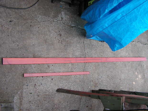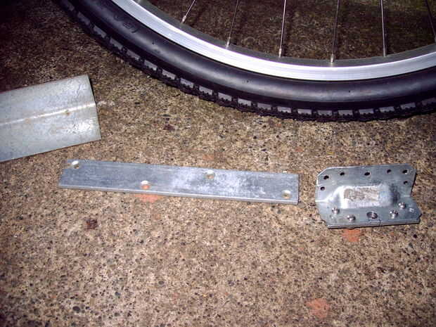 La idea en el primer paso es hacer estas dos piezas de madera más de lo necesario, basado en el tamaño de la rueda que se utiliza. Utilicé la madera más débil/más estrecho 1 x 2 para los soportes internos - porque había reforzado con mi (rectángulo de aliuminum overkill). La rueda bien unos 28" largo (para 26" mtb ruedas), así que corte el interior soporta para ser 36" de largo. 2" de longitud se superpondrán dos 1 x 3 piezas transversales para formar una junta en un futuro paso. Los 2 restantes "(36" - 28"- 4" = 4" total) o así sucesivamente cada extremo sobresale, pero se ve cool, porque se parece a una cabaña de madera. Las fotos no muestran la madera cortada, dos longitudes al azar de 1 x 2 y 1 x 3. En medio de estos soportes serán soportes de metal donde se fija la rueda. Hacer estas piezas a continuación abajo.