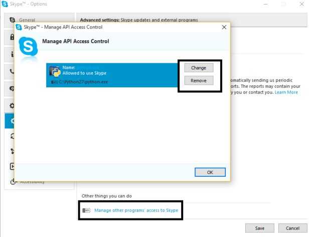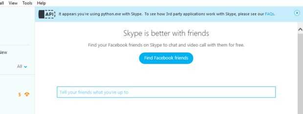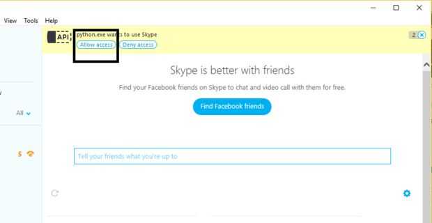 Por primera vez que ejecutas el programa necesita dar permisos para control de Skype con python.exe. Aparecerá un mensaje en la aplicación de Skype (ver imágenes) y le pedirá que autorice a python control de Skype.