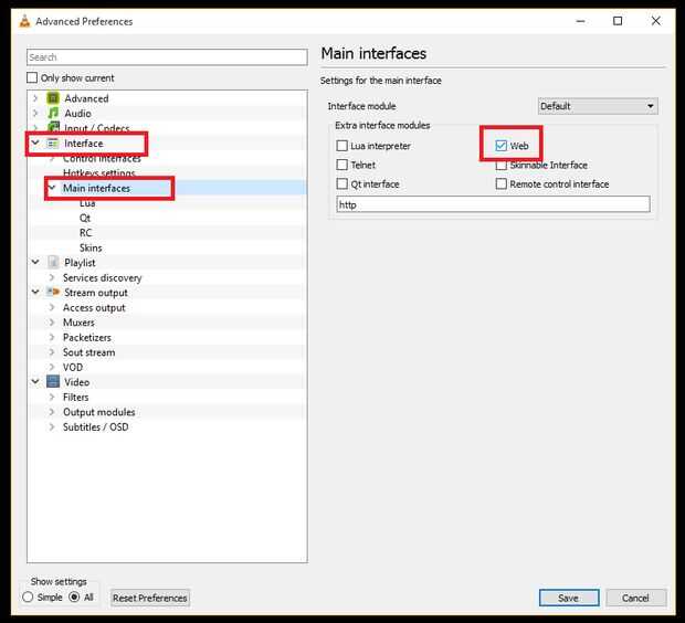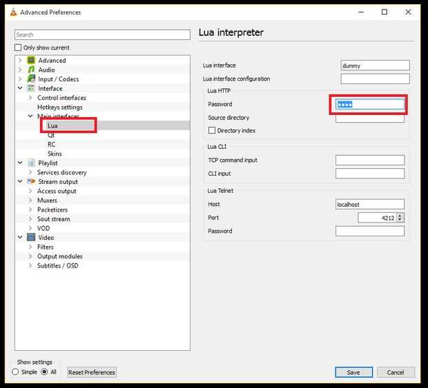 Usted necesitará configurar VLC para activar control HTTP. Para esto, vaya a "Herramientas" -> "Preferencias" y clic en "Mostrar configuración: todos". Luego vaya al "Interfaz","principal" y asegúrese de que está activada la opción "Web" y dice "http" en el cuadro de texto. Por último, ir a "Lua" (bajo "interfaz principal"), escriba la contraseña que desee en "Lua HTTP" y haga clic en guardar.
