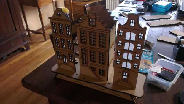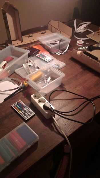 Compré una tira de led con adaptador en ebay por las luces de la casa. Soldar los leds. también puede comprar leds baratos en las tiendas, pero quería una luz. En el interior he puesto papel de calco.
