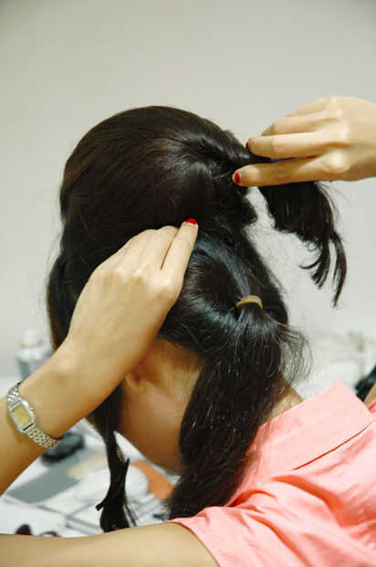 4. tease superior A parte de su pelo, use laca para el cabello y luego doblar hacia atrás. Gire el resto del cabello y clip con horquillas (ver foto).
