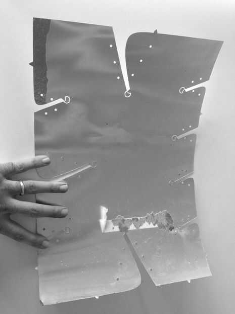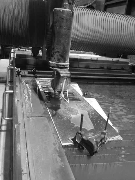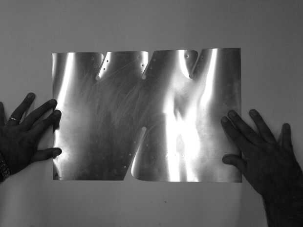 Desenrolle el modelo, marcado los agujeros y preparado un fichero DXF listo para corte por la máquina de chorro de agua OMAX. Las máscaras fueron fabricadas fuera de 14" por 25' rollo de chapa de aluminio con espesor de 0,012". Y para el espejo que usamos 1/8" espejadas acrílico que puede ser laser corte y etiquetada fichas para conectar a las superficies de las máscaras. Utilizamos el chorro de agua OMAX para cortar. El problema con este espesor es que ya que es muy delgada, después de cortar la hoja de aluminio puede permanecer plana. Por lo que la hoja debe ser pegada en una hoja más dura y cortan, que hace el proceso más largo.