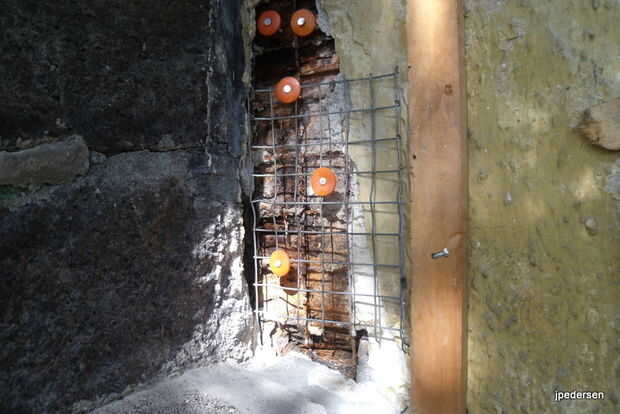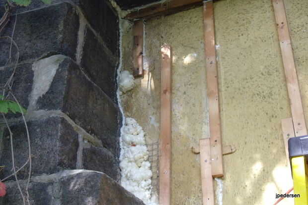 Aerosol espuma, utilizada para rellenar esquinas y huecos donde faltaba el estuco. Tela metálica y clavos para los tableros de espuma se utilizaron también si el daño de estuco era demasiado grande.