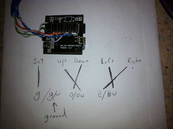 y se suelda el cable verde y blanco al lado del botón superior (tierra común). Puesto que todos los botones están conectados al mismo suelo. Este será el único tendremos conexión a tierra.  El resto de cables son soldadas una a cada una de las conexiones restantes del botón de abajo. (Mi diagrama es mostrado en la foto pero se puede atar con alambre cualquier color que usted prefiera. Asegúrese de documentar qué colores cable a cada bot!  Sería una lástima para conseguirlo todo cableado y vuelva a colocar juntos y no recuerdo qué cables hacen lo que.