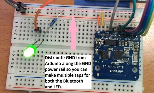Ahora obviamente una vez que la nRF se engancha para arriba, todavía hay un montón de pines abierto izquierda sobre Arduino y un montón de memoria vacía para agregar tus programas. Usted puede conectar muchos dispositivos diferentes. Le mostraremos cómo conectar un LED por ejemplo. Utilizando nuestro código, que puede descargar a continuación, debe ser capaz de convertir este LED encendido o apagado de su teléfono inteligente. Puede conectar otros sensores como sensor de temperatura o sensor de luz para dar la inteligencia adicional de LED, y puede controlar todo en su teléfono cuando está en alcance de bluetooth.