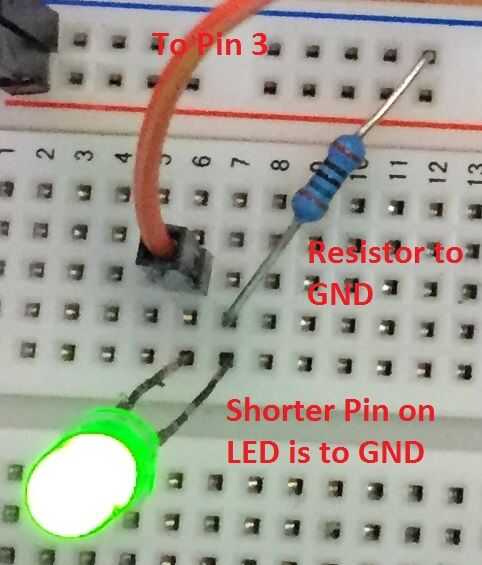 LED tienen 2 cables. El cable más corto es siempre negativo o "tierra". Para nuestro circuito, conecte el cable más largo a la clavija 3 de Arduino. Conecte el cable más corto a una resistencia, que se conecta a tierra. Recuerda que una placa completa de conexiones en una dirección solamente (a lo largo de las columnas), por lo que es muy importante colocar el LED a través de 2 diferentes columnas como se muestra en la imagen y además para conectar la resistencia a través de 2 diferentes columnas o entre una columna y el carril de la alimentación. Véase la imagen 1.