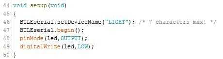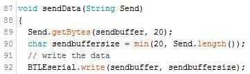 La función sendData es en línea 87. En el tiempo bucle, utilizamos la sendData comandos ("\nLED en") y sendData ("\nLED OFF"). El chip nRF8001 sólo puede enviar 20 caracteres a la vez, así que es la limitación en la función sendData así. El carácter \n no aparece, sino más bien provoca una nueva línea que aparecerá en la aplicación de smartphone (equivalente a un retorno de carro). Ver imagen 4.
