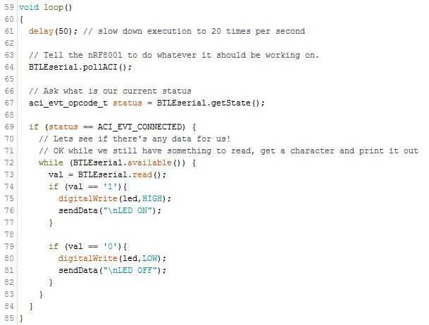 El resto del bucle se encarga de comunicarse con el código que se ve después de la Junta de Bluetooth. Usted probablemente puede ignorar hasta llegar a la línea 73. Aquí, un solo carácter se lee desde el bluetooth a la vez y colocado en la variable "val". Línea 74 usa un if () Declaración de averiguar qué personaje era leer. Todo entre el {} tras el if instrucción sólo sucede si eso si evalúa declaración para ser verdad. En línea 75 encendemos el LED estableciendo el pin 3 en alto. En la línea 76 utilizamos una función personalizada para enviar datos por bluetooth hacia el usuario. Comportamiento más complejo se puede agregar mediante la adición de más si () {} bloques. El código puede ajustarse para responder a comandos de letra diferente y manipular varios pernos o enviar datos posteriores en respuesta.