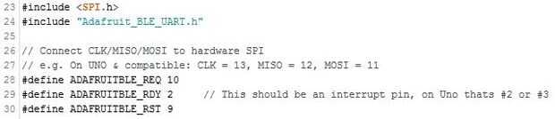 La primera sección importante es la línea 23 y 24. SPI.h debe ser incluido con el hardware SPI en Arduino. Adafruit_BLE_UART.h debe incluirse como una biblioteca en Arduino como se describe en la sección anterior, o se producirá un error. Esta biblioteca maneja todas las comunicaciones de bajo niveles a la Junta de Adafruit bluetooth - todo lo descrito en la sección SPI.