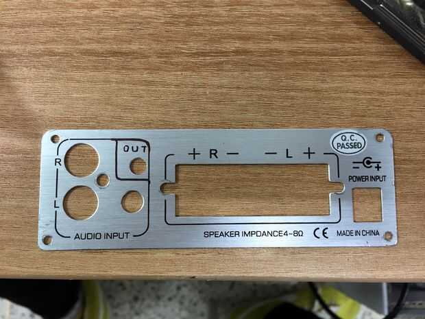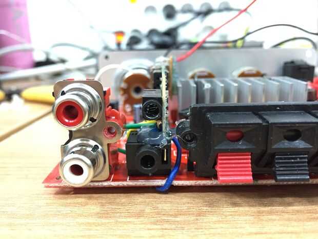 Directamente has soldado salida de audio al amplificador pero ¿qué acerca de la existente salida estéreo de 3,5 mm en el receptor de bluetooth? En caso de que desee agregar un subwoofer o algo, me perforaron el panel posterior con broca de 5,5 mm y escribió «salida». Coloque el receptor bluetooth y agregar el pegamento caliente para asegurar su lugar.