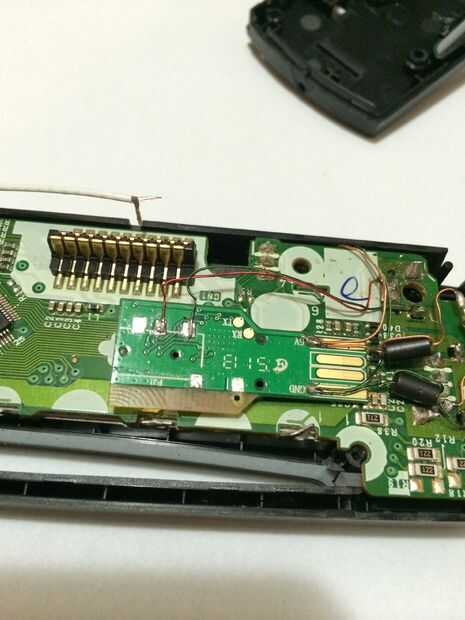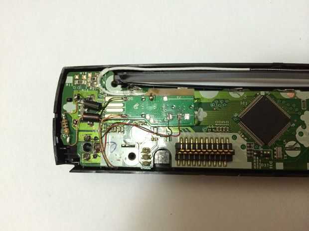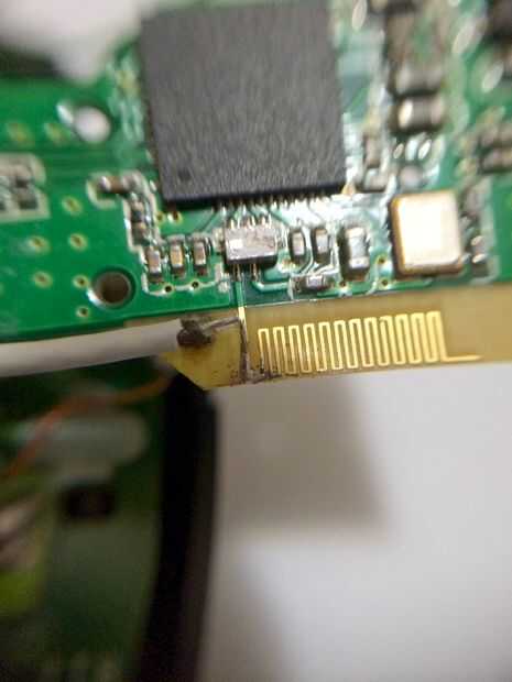Perforó un agujero cerca de la traza de la antena y en el otro lado rayado la máscara de la soldadura en el plano de tierra para crear un cojín de la tierra.