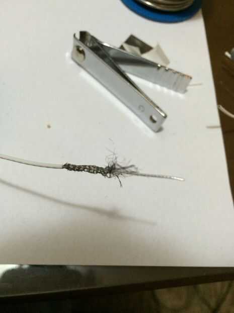 y soldar el cable coaxial a la tierra a través del orificio y el rastro de la antena.