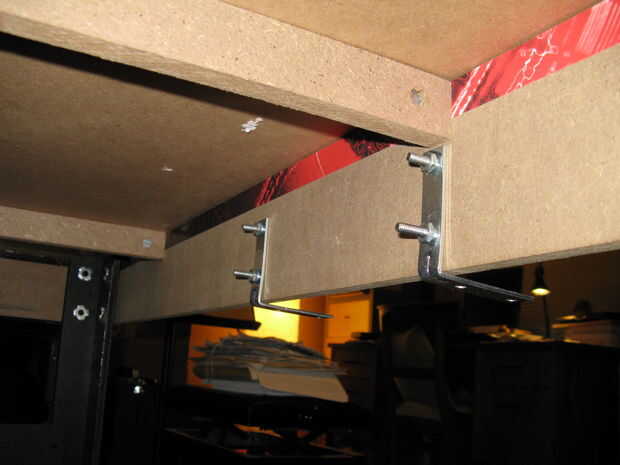 Adjuntar los soportes de ángulo para la tabla usando los pernos, tuercas y arandelas. (La siguiente foto muestra cómo todas las piezas.) Utilice la llave ajustable para sujetar las tuercas como apretar los tornillos con el destornillador.