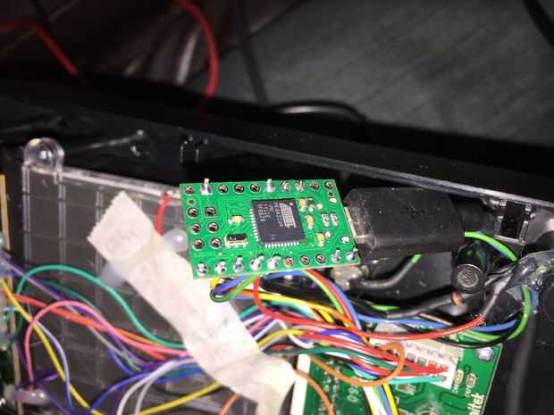 Ahora, refiriéndose a su cableado notas y esquema, soldar los cables directamente a la placa Arduino. Encontré que la Junta de enchufar el cable USB me permitió utilizarlo como una 'tercera mano' que siempre parecen necesitar al soldar. Cuando la soldadura se realiza, el tablero hasta la PC y compruebe que los botones respondan como esperas, sobre todo el sombrero del 4-way si está usando uno. Si tienes algo malo entonces, o curso, usted puede fijarlo en software, pero creo que es mejor corregir el cableado en esta etapa.