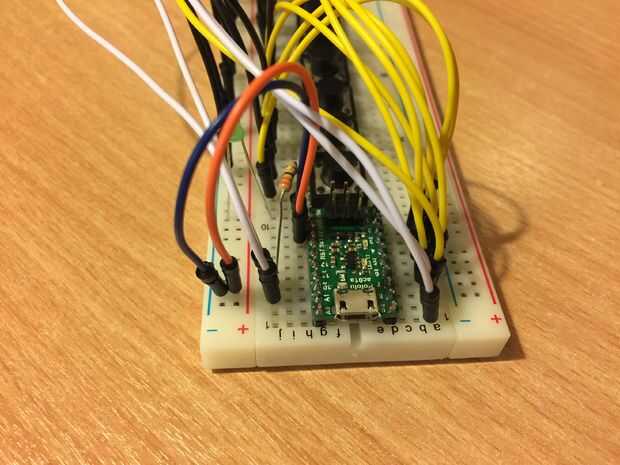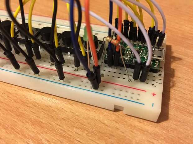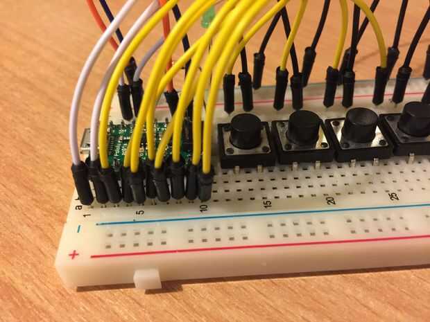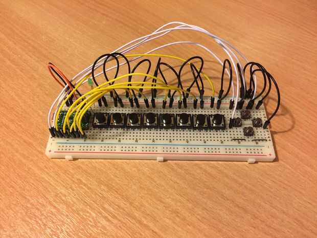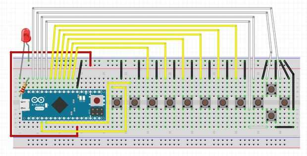 He creado una configuración simple con 8 Interruptores táctiles para los botones 1-8 y otro 4 pequeños interruptores representar el interruptor. Arduino puede establecer resistencias pull-up interna por lo que simplemente necesita conectar un lado de cada interruptor en el riel de la tierra y el otro a uno de los pines de entrada. Conecté los botones a los pines 0-7 y el hat-switch de 4 botones a los pines 8-11. También he añadido un LED con un resistor limitador al pin 12. Esto se puede montar en el joystick para indicar que el Arduino tiene poder y está ejecutando el código correctamente.