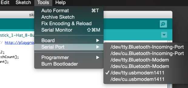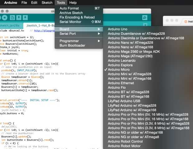 Conectar tu Arduino con el cable de PC (o Mac) con un micro-B USB y cargar el IDE. Deberá seleccionar el tipo de tarjeta y el puerto COM para tu Arduino. En mi caso fue 'Arduino Micro' y ' / dev/tty.usbmodem1411'. Windows mostrará los puertos COM como COM7 o similar.