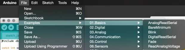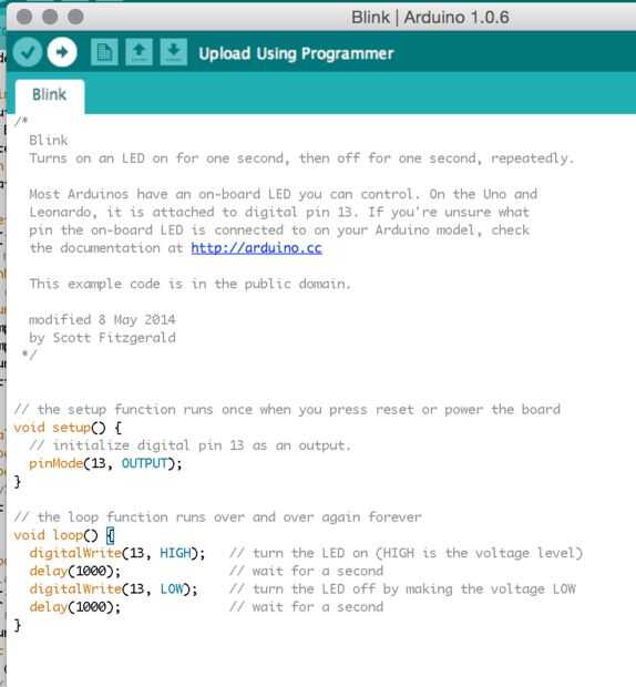 Una vez hayas hecho este seleccione Archivo >> ejemplos >> 01 conceptos básicos >> a parpadear. Esto cargará hasta un boceto simple ejemplo (Arduino programas se conocen como croquis) que empezará a parpadear un LED. El ejemplo utiliza el pin 13, que en la mayoría de las placas está conectado a un LED a bordo. Haga clic en el 'cargar mediante programador"(->) botón para cargar y ejecutar el sketch. Esto debe programar el Arduino y el LED a bordo deberá parpadear constantemente. Esto le permite saber que el Arduino es OK y tienes el IDE configurado correctamente.
