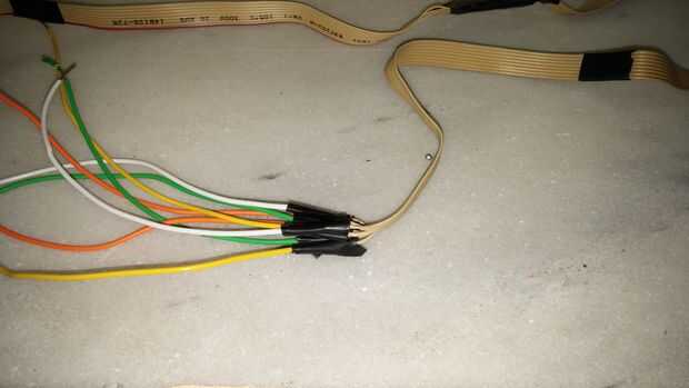 Tomar uno de los cables IDE, quitar los conectores de plástico en extremo y medio y con las tijeras con cuidado cortar hasta 4 (depende de tu proyecto una vez más) pares de cables se extravíen en la tira. Repetir este proceso una vez más y después de que la soldadura de las dos tiras pequeñas que sacó de un principal de cada cable que se terminan con 8 cables conectados uno al otro con el doble de la longitud del cable IDE original. Caliente pegamento o envolver con cinta aislante, asegurándose de que los cables desnudos no toquen. Necesidad de que sea bonito ya que no lo más probable es que fuera de la vista. Coloque algunos cinta aislante en el punto donde el conector del medio utilizado para pinchar el cable IDE, por si acaso.