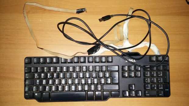 Desarmar el teclado y básicamente seguir este o cualquier similar instructable. Perforar o cortar unos agujeros para el cableado al pasar. Usted básicamente pegar en la capa superior e inferior cada extremo de cada par de cable de encargo. Opté por configurar las teclas del teclado 8,9,0 y + (el numpad). Puesto que el contacto no se estabilizará por soldadura debe rayar los puntos de contacto en las capas dentro del teclado para sacar algunas de la capa de semiconductor que se cubren con. No hay necesidad de hacer las conexiones finas (la silicona debe absorber cualquier volumen extra), lo único que (ya que el adhesivo de la cinta aislante probablemente gastará eventualmente) asegurará el flujo de corriente eléctrica de alambre al contacto de teclado es presión. En realidad he añadido algunas almohadillas de espuma (utilizadas para proteger artículos electrónicos dentro de su paquete) llevó a cabo justo en la parte superior de los puntos de contacto con cinta aisladora para asegurar que se estableció contacto, ya que de lo contrario esto no sucedía siempre. 0.7-1 cm debería ser suficiente dependiendo del grosor de la espuma-mina era bastante grueso. En este punto el contacto adecuado probablemente no se hará siempre, pero con la adición de la presión de la espuma después de que el teclado está montado otra vez debe ser muy bien.