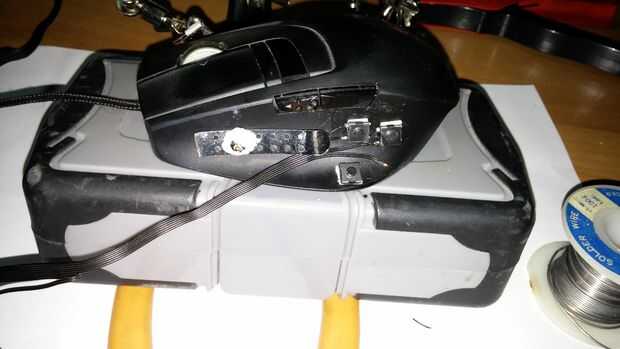 Una vez se sueldan tres pares, "abrazo" al lado de ratones con el cable como hacia el cable de usb y pegarlo con cinta de doble cara para que no se saca. Asegúrese de que el antes mencionado split está justo en el punto donde se conecta el cable usb para el ratón y luego seguir adelante y el restante par de cables al interruptor de final de la soldadura.