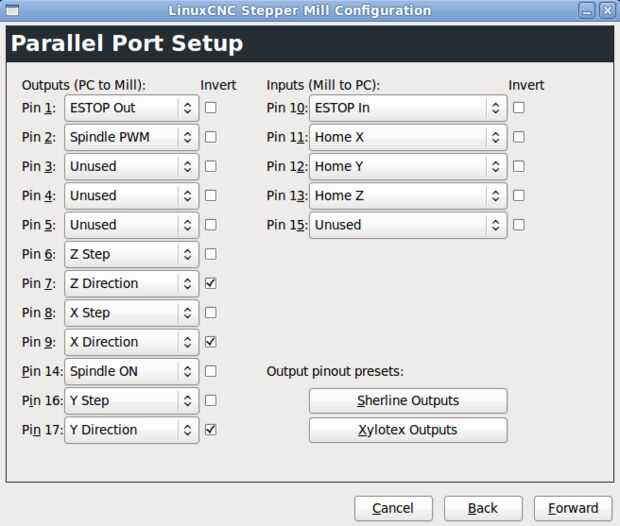 Estoy usando un tablero de control de CnC de 5 ejes de Toolworks Zen que está conectado a mi PC mediante un cable de puerto paralelo de 25 pines. Diecisiete de los pernos están disponibles para su uso, y ocho de ellos están reservado para otras funciones. Para mi setup he colocado mi huso en un protector contra sobretensiones separados de mi láser. De esta manera que solo puedo encender uno u otro, dependiendo de la utilizaré en un momento dado.