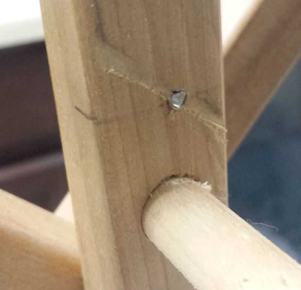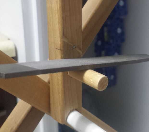 Con el agujero perforado es tiempo de instalar y modificar el tornillo. Coloque la punta del tornillo en el agujero piloto y darle un par de giros para conseguir comenzó. Luego conducir en la madera hasta que la cabeza esté a poca distancia de la superficie de contacto de la pierna larga. Dejando la cabeza que sobresale a poca distancia de la superficie hace una guía para la sierra, que ahora usarás para decapitar el tornillo. Una vez que el tornillo se descabeza utilice una lima plana para alisar fuera del eje de tornillo y asegúrese de que quede a ras con la superficie de la pierna. Una superficie plana también ayudará a asegurar un buen contacto con el imán. Repita este proceso en otros pata de soporte de la rejilla de secado.