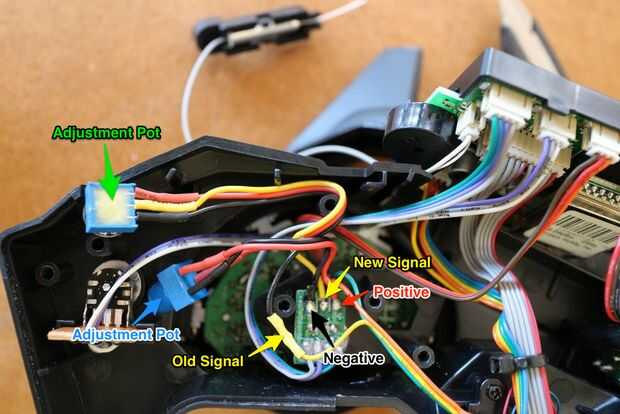 Este paso implica finalmente modificar la electrónica del transmisor. A Desconecte el limpiador / cable de señal desde el potenciómetro existente y conéctelo a la pata 1 (negro) del potenciómetro de ajuste. Usted podría alambre directamente, pero he encontrado que el alambre existente no es tiempo suficiente para trabajar con.