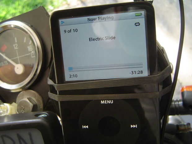 Usar gancho y sujetador del lazo, cinta de doble cara, lazos de bongo o algo similar. Así, se puede quitar el reproductor de MP3 para la seguridad.