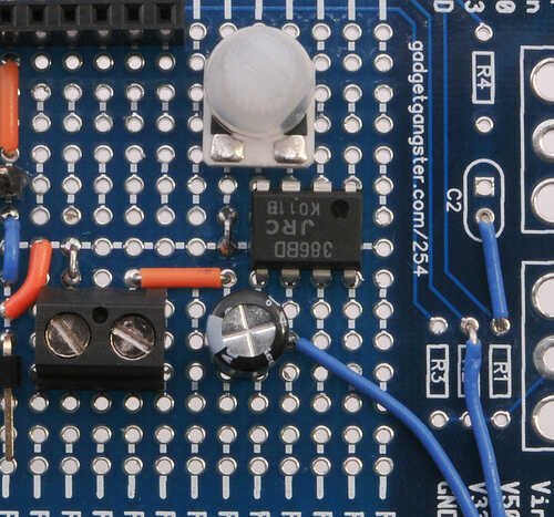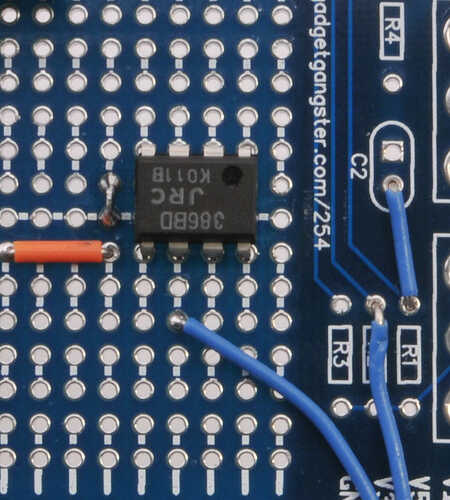 Añadir el amplificador de audio (LM386). Observe la posición de la muesca en el chip en lo referente a la Junta;