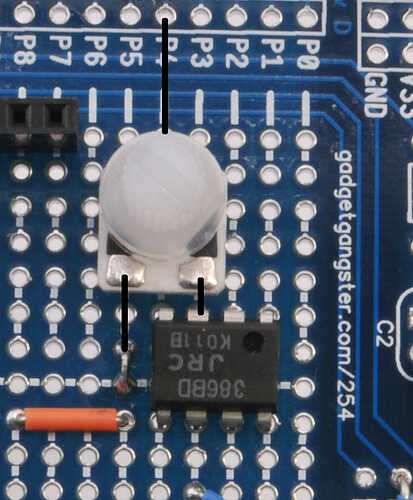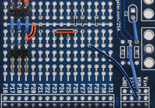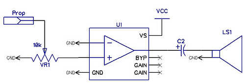 El pin medio de la perilla se conecta a P4 en la plataforma de la hélice. Una pierna se conecta con el tercer pin del amplificador, y el otro pin se conecta a tierra.
