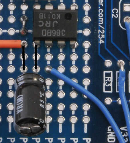 Observe la raya en el condensador. Indica el lado negativo, y debe ir como se muestra en la foto.