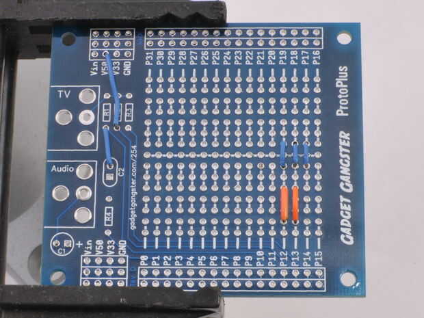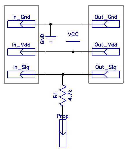 Dibujamos un poco poder (a través de Vcc) para ejecutar el animador de R/C y el resto va en al servo. Nos espía sobre el estado del servo a través de un 4.7 k ohm resistor conectado al cable de señal del servo.