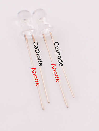 La mnemónica que usar es que 'menos plomo' es una cosa negativa, por lo tanto es el cátodo. De plomo es algo positivo, por lo que es el ánodo. Todos los LED en el cuerpo tendrán sus cátodos (corto conduce) conectados juntos, en una cadena. Al final de la cadena, agregar un pie o tan del alambre de conexión, esto eventualmente conectará hacia el animador de R/C;