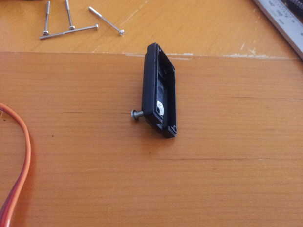 8) Retire el tornillo de la máquina y colocar cuernos servo que requiere utilizar segunda tuerca como espaciador del cuerpo del servo. Tornillo rosca en cuerpo del servo.