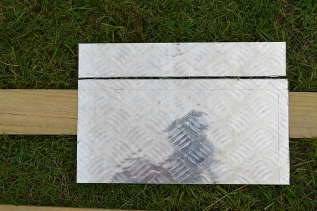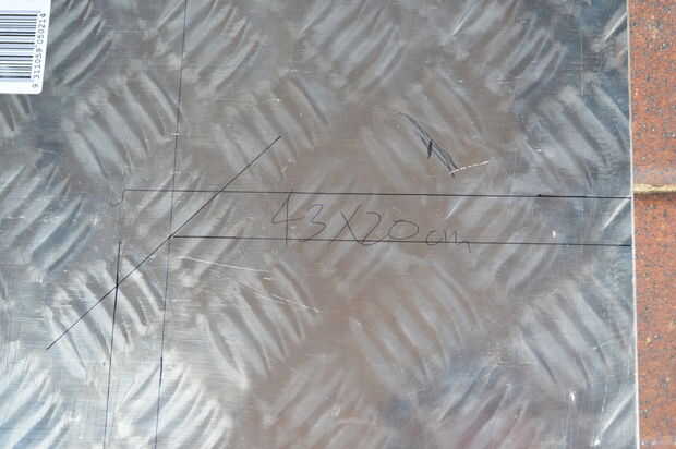 El caso mide 430 x 200mm, así que saqué que el tamaño de la placa y luego añade un borde de 20 mm de. Entonces usando la escuadra poner un ángulo de 45 grados en la esquina de las marcas de 430 x 200mm.