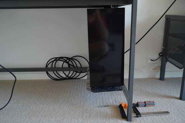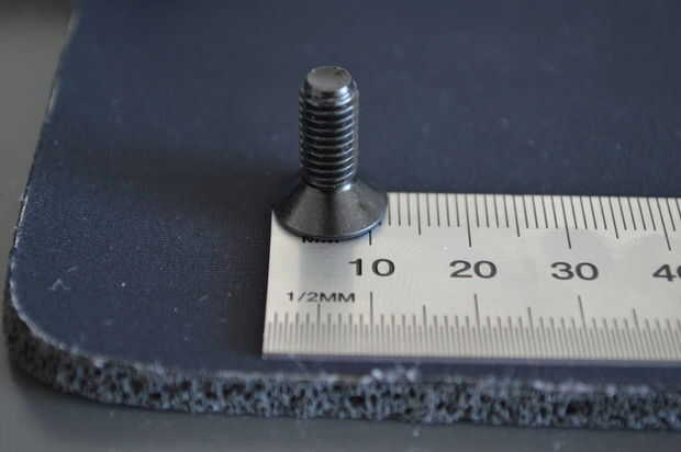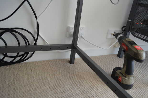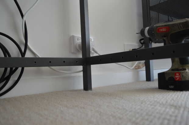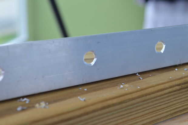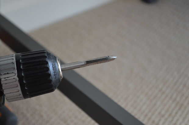 Para enhebrar cada agujero con el grifo de la banda de rodadura de 6mm, cada marca fue perforado con una broca de 5,5 mm. Esto permite que la barra de ángulo que tornillo directamente en el armazón de escritorio.