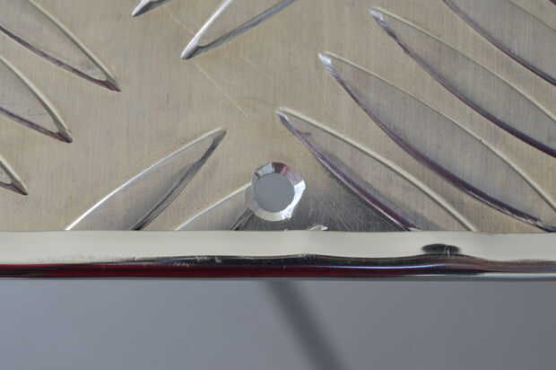 Terminé usando bordes de puerta de coche de cromo encontré en Ebay. Añadiendo a esto era muy fácil y sólo recorte los bordes y luego cortar las esquinas en ángulo a la línea con las otras piezas. El remate vino con pegamento en el interior así que no requiere ninguna otra fijación.