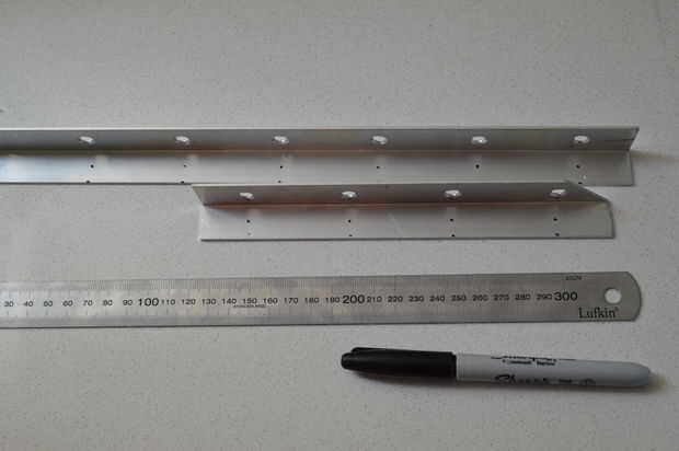 Marcado cada agujero aproximadamente 50mm aparte. Esto fue probablemente demasiado terminé utilizando tornillos mucho más de necesario. Usted podría conseguir lejos con 100mm de espacio fácilmente.