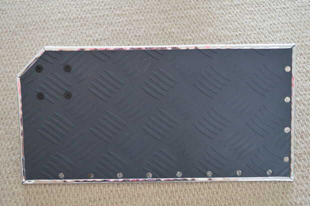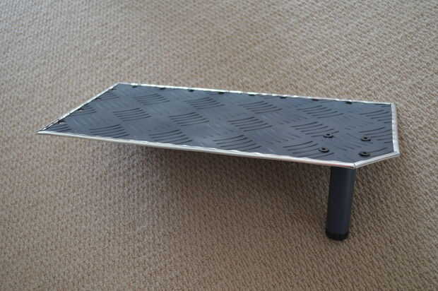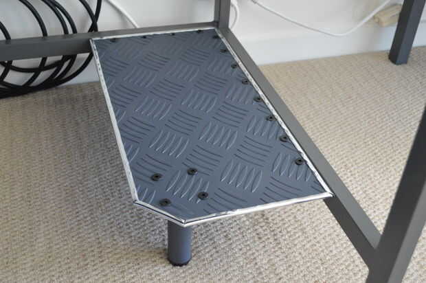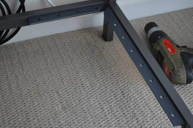 Después de dejar que las cosas a secar durante aproximadamente una hora, volví el cromo trim a la placa y empernada en la pierna con el pie ajustable. La forma más fácil de fijar la placa al armazón de escritorio era tornillo de la barra de ángulo para el escritorio y luego la placa del perno a la barra de ángulo.