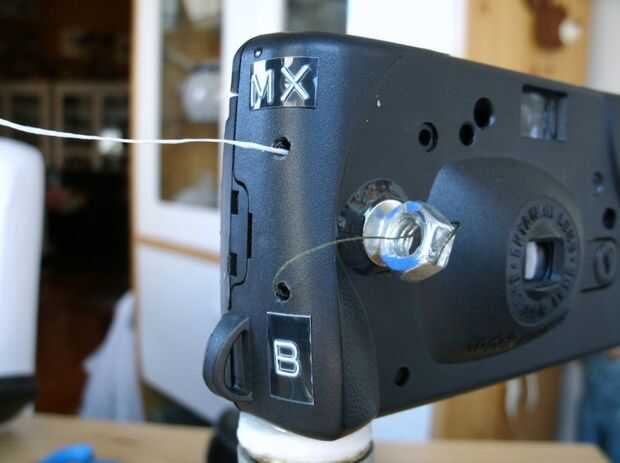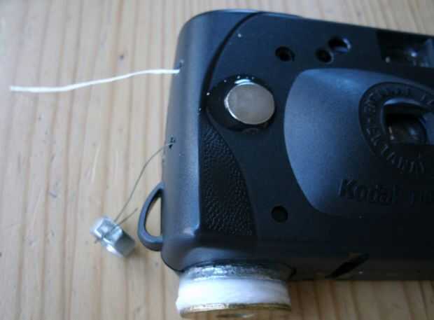 1. la función del bulbo es muy sensible. Para impedir que el hilo se quede atrapado, pegue un imán hacia el frente y cola o atar un ferroso arandela o tuerca en la rosca. Esto mantendrá la tensión de la pala del obturador para la operación normal. Una tuerca pesada fue elegido en este caso para mantener el obturador abierto si se queda colgado gratis