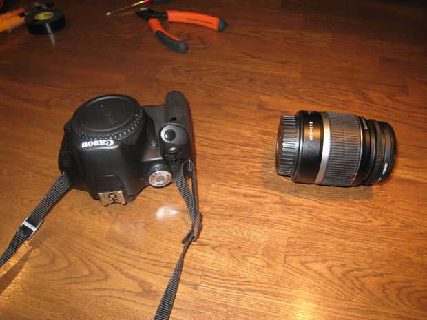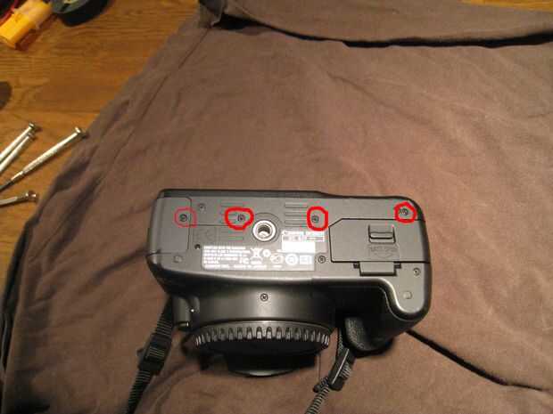 Hay 8 tornillos, necesarios para abrir la cámara. Cada lado tiene 2, la parte inferior tiene 3 y el interior es un tornillo de plata que debe quitar. Te recomiendo a partir de un lado y hacia el otro lado quitando cada uno en orden y realizar un seguimiento de la orden de trabajo. Usted podría tratar de poner un pedazo de lado pegajoso de la cinta en la mesa para mantener a los tornillos en el orden correcto. Esto es importante porque son todos de diferentes tamaños.
