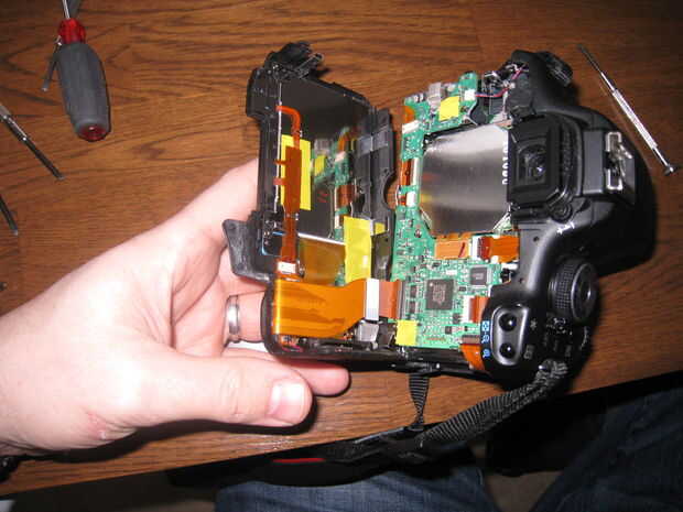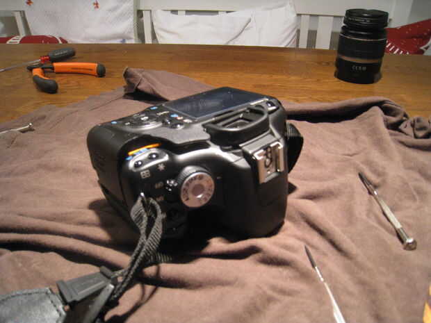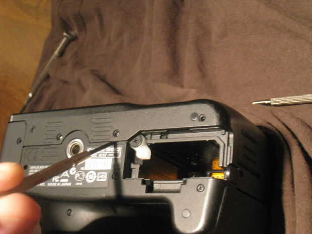 Ahora que los tornillos se han ido puede quitar la parte posterior de la cámara. Se puede ver en el cuadro que empecé a bajar por la puerta de la batería. Usando un pequeño destornillador de cabeza plana de palanca abierto las dos piezas con cuidado para no rayar el plástico. He trabajado mi manera hacia la izquierda alrededor del lado derecho y en la parte superior de la cámara.