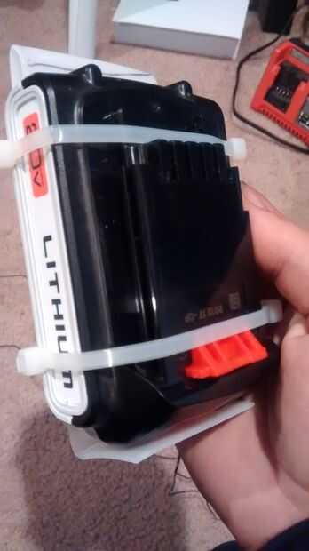 La batería se iba a unir a mi banda detrás de mí, así que hice el soporte de plástico lil con ataduras de cremallera para mantener en su lugar. Conectores de tipo cuchilla hacen más fácil de conectar a la batería, y sólo torcer los cables y sujetar con pegamento (esto no iba a ser un sistema permanente, por lo que no necesita para la soldadura y todo lo que) caliente.