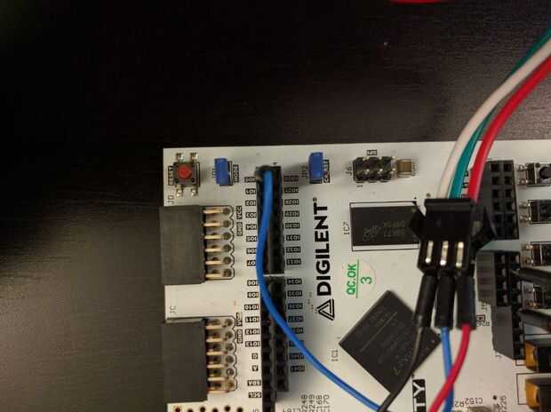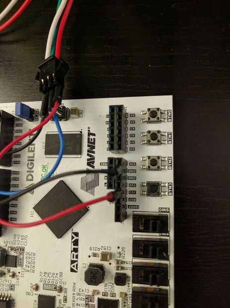 Sólo 3 conexiones deban hacerse en los cables de puente de Arty. uso, conecte la línea de datos de la tira del LED al pin IO0 de Arty y alimentación y tierra a 3V3 y GND, respectivamente. Asegúrese que la línea de datos del lado de entrada de la tira LED.