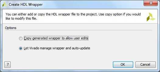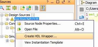 Ahora que el diseño de bloque se puede crear un contenedor. No esta abierto las fuentes ficha y haga clic en el diseño de bloque, seleccionar crear contenedor de HDL. En el pop-up ventana Asegúrese que el Vivado que manejar opción de envoltura y actualización automática está seleccionada. Ahora se puede generar el flujo de bits. Si Vivado pide realizar síntesis e implementación decir OK.