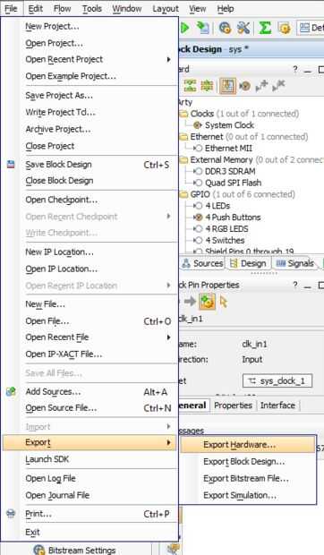 Ahora que se ha generado el bitstream exportación el hardware con archivo -> Exportar -> Exportar Hardware, marque la casilla incluir Bitstream cuando aparece el cuadro de diálogo. Esto generará algunos archivos que usa el SDK para generar sus binarios. Siguiente abrir el SDK con archivo -> ejecutar SDK.