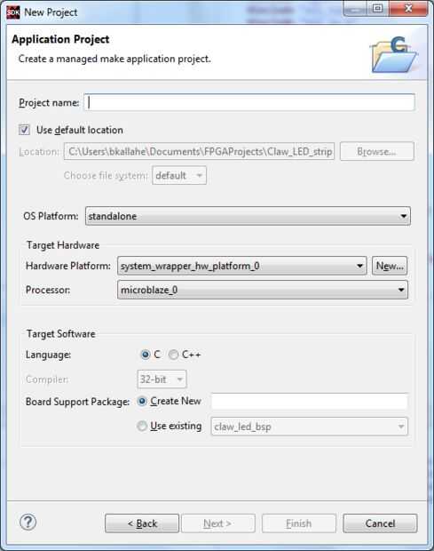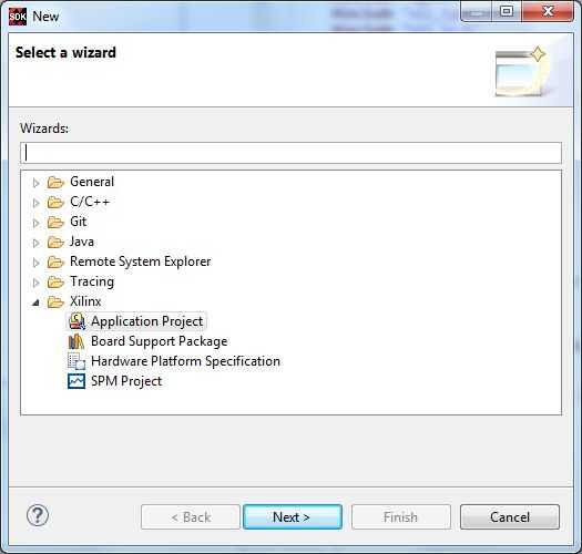 Ahora que ha abierto el SDK, hay que crear un nuevo proyecto de aplicación de Xilinx. Haga clic en el botón nuevo en la barra de herramientas y seleccione Xilinx -> proyecto de aplicación. Haga clic en siguiente y el proyecto un nombre que no contiene espacios ni caracteres especiales. Haga clic en finalizar para crear el proyecto y las dependencias.