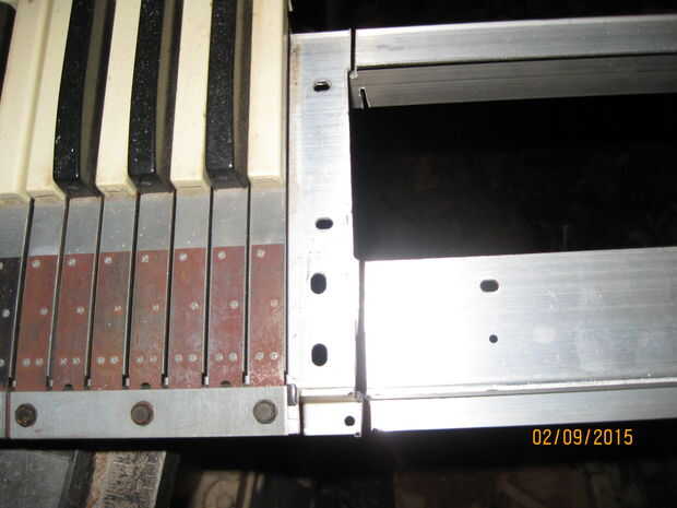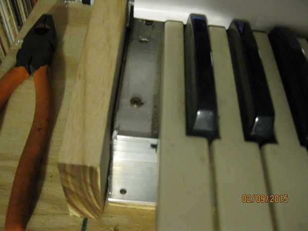 Con el corte de los soportes de aluminio que era tiempo de colocarlas. Utilicé una regla para medir y marcar las posiciones de soporte ideal, teniendo en cuenta el espesor de la PVC y el labio por la pieza lateral es ligeramente más grande que el sintetizador actual. He perforado los agujeros de montaje y adjunto los soportes con tornillos recuperados.