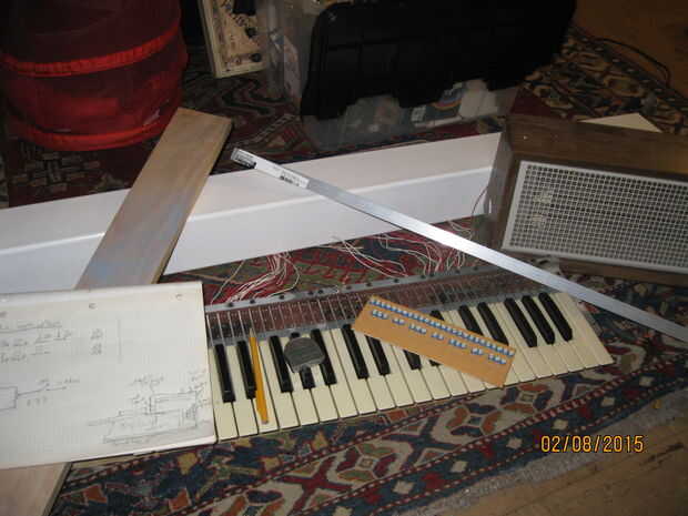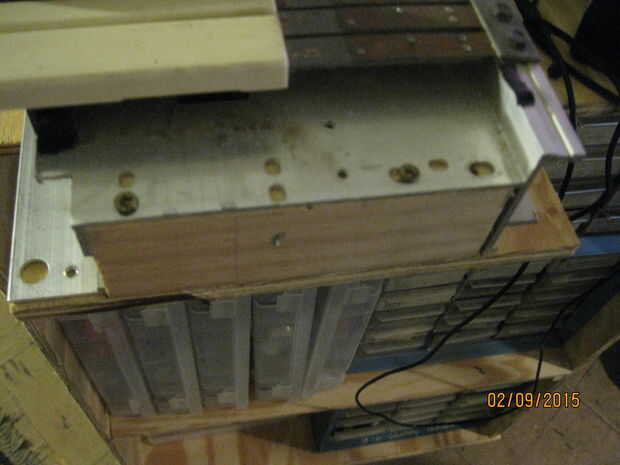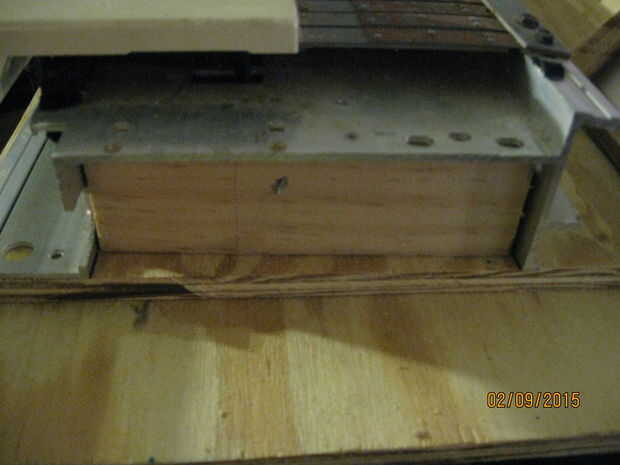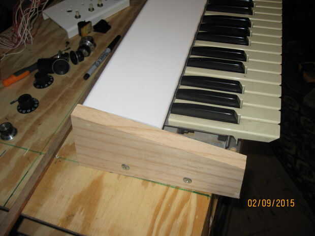 Trazó el perfil de la Asamblea de base, tapa y teclado parcialmente ensamblado para determinar la forma de las piezas finales. Corté las formas de un pedazo de selección Pino 1 x 6. También corté un par de cuadras del final de otro chatarra de 1 x 2. Tenía un pedazo de madera contrachapada de chatarra que era el ancho perfecto, así que corte a la longitud y fue-el resto de la caja sería plástico y aluminio. Que une los bloques de extremo en la base de madera con tornillos recuperadas y había conectado el conjunto de teclado a la base con tornillos a través del marco en sobre los bloques de extremo.